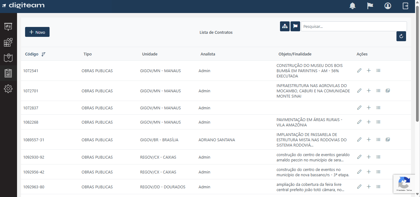 Ao entrar na área de contratos, você verá a lista de todos os contratos já criados.