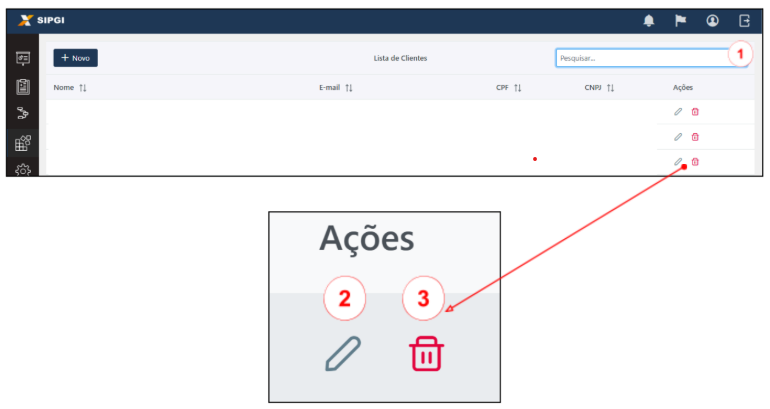 Nesta tela, além da pesquisa, também é possível editar (2) ou excluir (3) os dados do cliente, desde que o usuário possua as permissões de perfil necessárias.