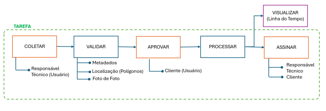 Ação do Sistema: O sistema atribui a tarefa de Coleta ao perfil de Coletor (Responsável Técnico) e a tarefa de Aprovação ao seu perfil de Aprovador (Cliente).