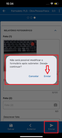 Aviso Importante: Antes de enviar, o sistema avisa que, após o envio para validação, o formulário não poderá ser modificado, a menos que seja rejeitado pelo Aprovador.