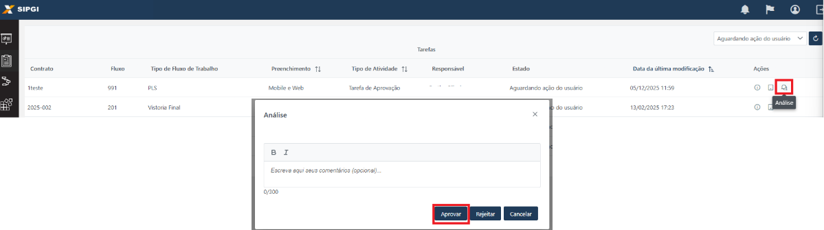 O Aprovador pode inserir uma nota de observação em sua análise.